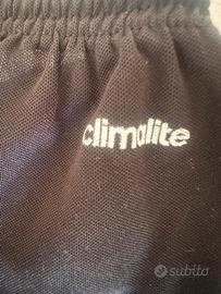 pantaloncini sportivi Adidas di colore nero con le classiche tre strisce bianche lungo i lati. Hanno un elastico in vita e una coulisse per la regolazione. realizzati in Climalite, un materiale proprietario di Adidas, studiato per allontanare il sudore dalla pelle, garantendo una sensazione di asciutto e comfort durante l'attività fisica.