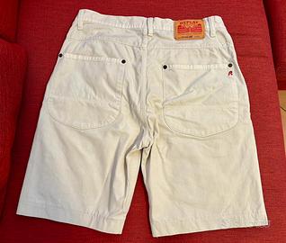 Bermuda da uomo usati, in buone condizioni, tinta bianco panna, taglia 30, chiusura con bottone e zip, presenti 2 tasche anteriori e 2 tasche posteriori. Logo R ricamato in tinta rossa sulla tasca posteriore destra