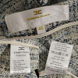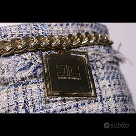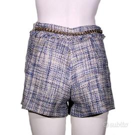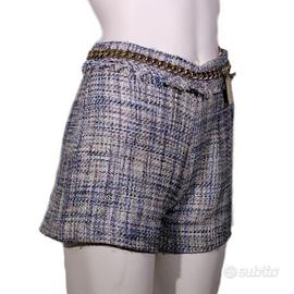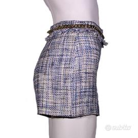Mini shorts di Elisabetta Franchi. Tg.40. Vestono stretto. Il tessuto ricorda lo stile del tweed Classico, intreccato su bianco/azzurro/blu. La vita, che termina in piccolissime frange, è sormontata da una cintura in metallo dorato che racchiude il logo Elisabetta Franchi, in un quadratino di metallo sempre dorato. Usato un paio di volte. Può essere utilizzato sia di giorno che con una giacca elegante anche per la sera, con un cappotto leggermente lungo.