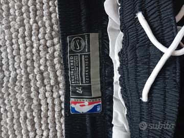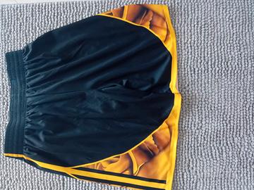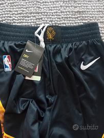Questi pantaloncini da basket sono ispirati all'NBA, di colore nero con dettagli giallo oro. Presentano il logo Nike bianco sul lato destro e il logo NBA sul lato sinistro. Al centro della fascia elastica c'è un simbolo dorato (forse ispirato a una squadra o a un’edizione speciale). I lati hanno un design grafico con sfumature arancioni e motivi astratti che richiamano l’energia del gioco. Stile sportivo, perfetti per chi ama il basket o look streetwear.
