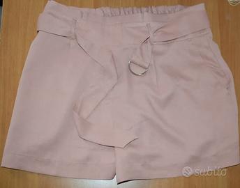 Pantaloncini rosa chiaro,con cintura in tessuto e fibbia ad anello in metallo, con fascia elastica sul retro.