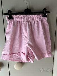 Deliziosi pantaloncini color rosa pastello, dal design semplice e femminile. Realizzati in tessuto leggero e traspirante, presentano una finitura leggermente stropicciata che dona un look casual ma curato.