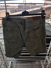 Pantaloncino corto uomo Jack & Jones verde militare tipo jeans. Chiusura con bottone e cerniera. Logo riportato all' interno, sul bottone e sul retro. Taglia M regular. Indossato poco.