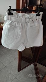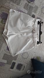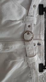pantaloncini a vita alta colore bianco con bottoni a pressione e cintura corredata con fibbia con strass. il pantaloncino è in tessuto denim taglia 42 con gli spacchi laterali