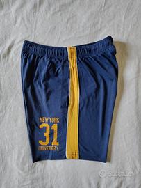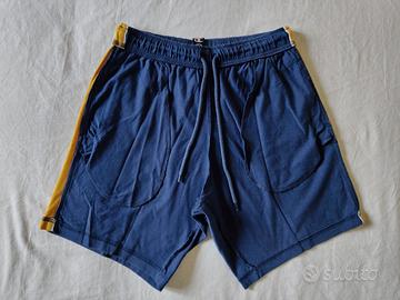 Pantaloncino marca Champion, in cotone, blu, bande laterali e scritta su gamba davanti giallo carico, tasche grandi, in vita elastico e cordino. Usato poco, veste comodo, pari al nuovo, misure reali come da foto.