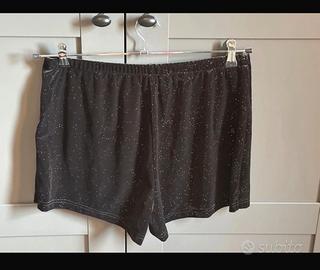 Pantaloncino simil gonna nero con brillantini oro Misure: Dimensioni vita: 78-112 cm, Fianchi: 104 cm, Lunghezza: 32.6 cm, Cucitura interna: 5.5 cm