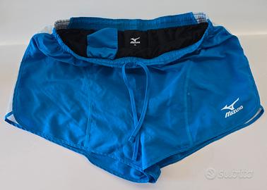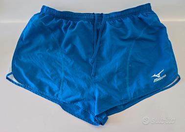 pantaloncini da corsa Mizuno originali, modello Split, taglia XL. Colore blu con logo Mizuno bianco stampato sulla gamba destra. Ideali per allenamenti e gare su pista o strada grazie al design ergonomico e al tessuto tecnico leggero.