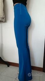 "Pantaloni a zampa blu elettrico in tessuto elasticizzato. Vita alta e vestibilità aderente. Perfetti per un look vintage e moderno."