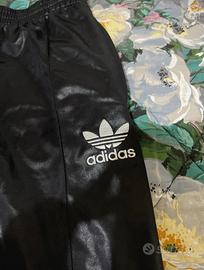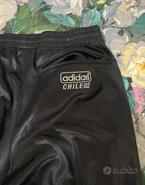 Pantalone Adidas Chile 62 originale in colore nero con caratteristico effetto lucido, perfetto per uno stile streetwear deciso e riconoscibile. Presenta le iconiche tre strisce laterali e il logo Adidas ricamato sul lato, simbolo di qualità e autenticità.