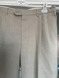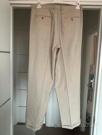 Il tessuto è una lana leggera di alta qualità, color beige sabbia melange. Il modello presenta doppie pinces, gamba con risvolto e finiture di pregio.