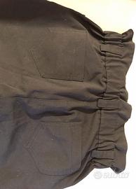 Il taglio della gamba è dritto o leggermente affusolato, rendendo il pantalone comodo e adattabile a diverse corporature e stili. Le caviglie presentano un risvolto cucito con precisione, che aggiunge un tocco casual-chic e permette di valorizzare al meglio scarpe e stivali. Sul retro, il pantalone è dotato di due pratiche tasche applicate (a toppa) che aggiungono funzionalità e un ulteriore elemento di stile casual. Il colore nero classico lo rende estremamente versatile e facile da abbinare con qualsiasi tonalità e tipo di outfit. Questo capo, sebbene usato, si presenta in ottime condizioni e ben curato, pronto per essere subito indossato.
