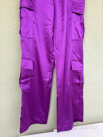 Pantalone donna marca Calliope, nuovo con cartellino, taglia S, colore viola. Misure: circonferenza vita da 66 fino a 84 cm (con molla), circonferenza fianchi 92 cm, lunghezza totale 107 cm.