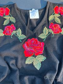 Blusa viscosa nera con pois fuxia e bottoni gioiello a collo e polso