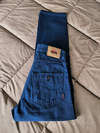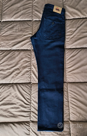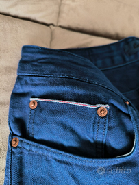 Pantalone cotone taglio jeans con cimosa e cucitura fondo a catenella.