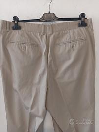 Pantalone classico da uomo color beige chiaro, stile elegante/casual. Modello con pinces frontali, chiusura con zip e bottone, passanti per cintura. Anni 90 made in Italy Presenta tasche laterali oblique e tasche posteriori a filetto con bottone. Vestibilità regolare con gamba dritta leggermente ampia, ideale per outfit sia formali che smart casual. Realizzato in tessuto leggero (etichetta interna 65% poliestere 35% cotone), comodo e adatto a tutte le stagioni. Taglia indicata: 54 ma veste meno controllate le misure Colore: beige / sabbia Condizioni ottime come lo stato di conservazione Misure Vita 44 cm Cavallo 30 cm Lunghezza totale 100 cm Larghezza coscia 34 cm Larghezza caviglia 24 cm