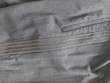 Con elastico e cordoncino in vita, con decorazione laterale luccicante, tasca posteriore destra eliminata ( possibile richiedere foto di questa parte). Taglia indicata 40, indossato tuttavia comodo da 44. Misure: vita 76 a fermo e 90 elasticizzato; fianco 108cm. Lunghezza 103cm.