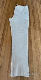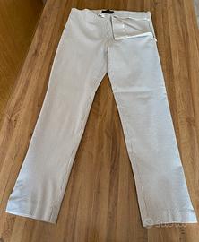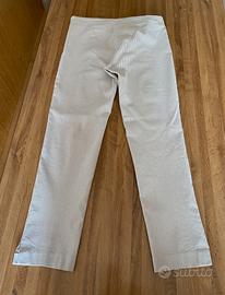 Pantalone donna a tubino lunghezza sopra la caviglia in cotone elasticizzato fondo panna con righe beige. Apertura con zip su fianco sinistro. Taglia S usato pochissimo Made in Italy
