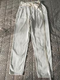 Pantalone donna in denim panna con 5 tasche ,vita alta, con fiocco in vita.