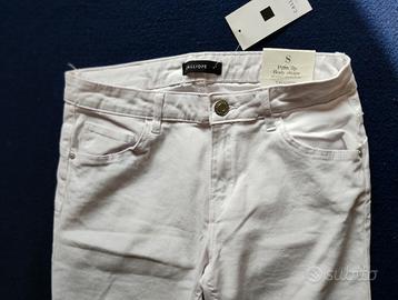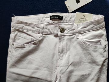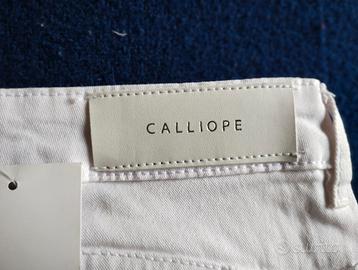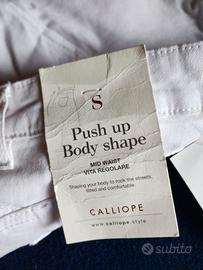 primaverile pantalone push up di colore bianco con cerniera e bottone più 4 tasche. al 98% in cotone e 2% in elastane. taglia indicata S (vita 36 centimetri, lunghezza 90 cm). marca Calliope. il pantalone è nuovo con targhetta.