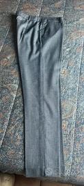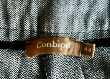 Pantalone donna Conbipel taglia 44, motivo tessuto spigato nero/bianco, girovita cm 80, girofianchi cm 100, lunghezza cm 95, presente tessuto in orlo sottostante, 2 tasche incise sui fianchi e passanti in vita.
