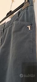 Pantalone donna Trussardi gamba larga (flare) Pantalone elegante Trussardi da donna, colore blu. Modello a vita regolare con gamba ampia a zampa (flare), vestibilità comoda ma strutturata. Chiusura con bottone e zip, passanti per cintura, tasche laterali. Logo “T” in metallo applicato sul fianco. Tessuto di qualità (cotone con elastan), adatto sia a look casual che più eleganti. Taglia: 42