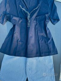 Maglietta blu elegante in filo di scozia con decoro di brillantini. Manica corta