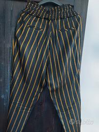pantalone nero con righe dorate, vita con elastico, bordo elastico in vita "sfrangiato", taglia 44,.