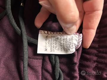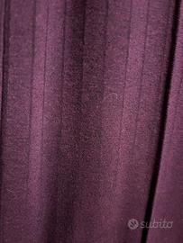 Pantalone gessato tono su tono borgogna con coulisse in vita. Made in Italy. Taglia L (44 IT) Composizione: poliestere/viscosa/elastam Molto morbido e confortevole Nuovo, Mai indossato perché essendo alta per i miei gusti risulta troppo corto e non c’è abbastanza tessuto per allungare l’orlo.