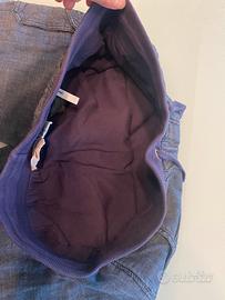 Due tasche finte sul retro, due tasche a livello vita + 1 tasca con bottone su coscia sinistra. Tessuto: cotone leggero colore jeans, internamente integrato con ulteriore strato di tessuto colore blu. Il tutto risulta comunque leggero e morbido.