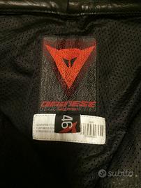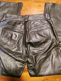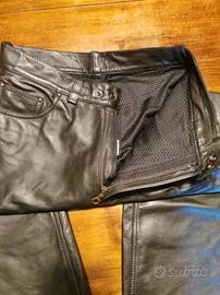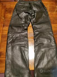 Pantalone taglia 46 in pelle, colore nero, marca Dainese. Usati due volte, praticamente nuovi. Nessun graffio. Chiusura in vita con due automatici in metalli, cerniera e passanti per cintura. Interno rivestito con fodera retata