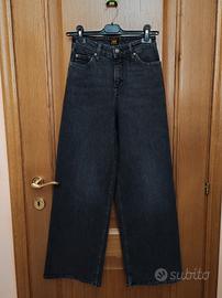 Jeans da donna in denim nero, 5 tasche, vestibilità comoda e design wide leg, vita alta, chiusura frontale con zip e bottone.
