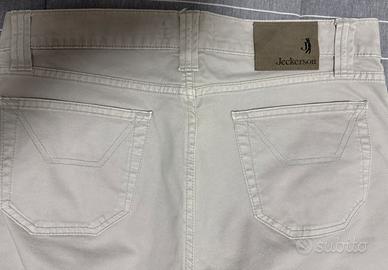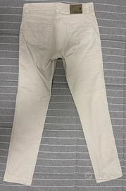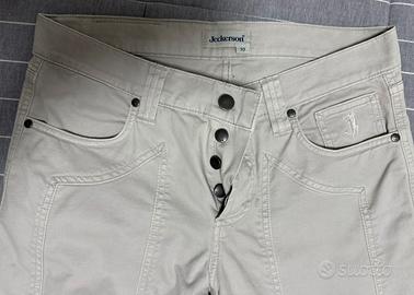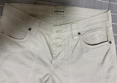 Pantalone a cinque tasche; patta con chiusura a bottoni, due tasche posteriori, una coin pocket e due tasche frontali. Pantalone con iconico inserto toppa Jeckerson, di colore grigio chiaro, tessuto resistente. La vestibilità è la comodità sono ottime, le condizioni del prodotto sono perfette in quanto è stato usato poche volte e ben mantenuto.