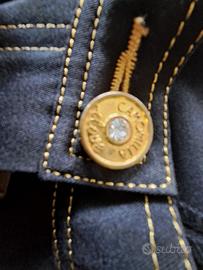 particolare pantalone nero in tessuto leggero di Camomilla, con profili in oro, bottone sul davanti di chiusura con brillante e lampo in oro e taschine con brillantini,sul dietro due taschine sempre con profili in oro e targhetta dorata con brillantini con scritta Camomilla.questo pantalone è particolare perchè mentre ha la forma di un gins, è reso elegante dai profili in oro,dalla targhetta,dal bottone e dai brillanti,unisce lo sportivo all'elegante.Unico nel suo genere ed in perfetto stao,mai usato,ma non nella confezione originale. taglia 42