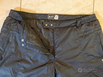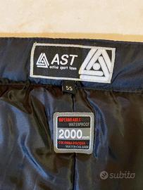 Pantalone da neve impermeabile (vedi dettaglio waterproof in foto) colore nero e taglia 55 uomo. In vita è largo cm. 56 quindi per un giro vita di oltre cm. 112 poiché ha anche l'elastico. La lunghezza della gamba da sotto il cavallo alla caviglia è circa cm. 82 e dalla vita alla caviglia è circa cm. 112. Dotato di tasche con cerniera e dettaglio con logo AST.