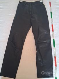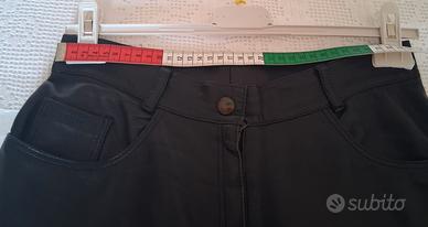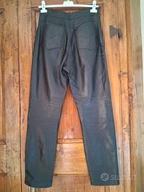 Pantalone taglio jeans 5 tasche in vera pelle, colore nero. La gamba è diritta, a sigaretta. Chiusura cerniera+automatico. Per chi non lo sapesse, la vera pelle assorbe il calore del corpo e d'inverno è calda e antivento.