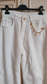 Pantalone a palazzo, a vita alta, caldo e felpato. Nuovo con cartellino. Taglia Large.Colore bianco latte. Misure: vita cm34; Fianchi cm54; Lunghezza da cavallo cm 70