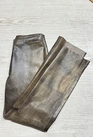 Pantalone taglio classico a vita alta, in vera pelle 100%, morbida nappa, colore nero/marroncino. La nappa conciata in Italia nelle migliori concerie ha una stupenda rifinizione martellata che le conferisce questo effetto di colore indefinito ma stupendo. Lavorazione Artigianale. Made in Italy. Alta moda Vintage. Nuovo con cartellino. Marcato tg 44, verificare misure: vita alta 72 cm, fianco 103 cm, lunghezza 110 cm taglio vivo. Dopo l’acquisto vi spiego come accorciarli (se dovesse servire) senza andare dalla sarta. Prezzo negozio 485€.
