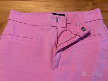 Pantalone Zara da donna color rosa, modello flare / a zampa, super trendy e femminile. Linea elegante che slancia la figura, vita regolare e tessuto leggermente elasticizzato per una vestibilità comoda ma strutturata.