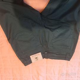 Pantalone a vita bassa con cuciture sulle gambe a tipo cavallerizza di colore verde scuro in cotone made in italy