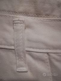 pantaloni color panna, 100% cotone pesante, gamba larga, dal taglio molto particolare, doppia battitura in cintura con 5 passanti , 2 tasconi anteriori con taglio a rondine, 2 tasche posteriori con chiusura dotata di apposito passante gigante con allacciatura dotata di bottone, cuciture decoro orizzontale sulle gambe. Nuovi con cartellino, TG 42
