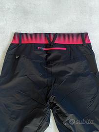 Pantaloni tecnici Salewa in ottime condizioni, perfetti per montagna, trekking o attività outdoor. Vita elasticizzata molto comoda con dettagli fucsia, zip alle caviglie e tasche frontali con chiusura lampo