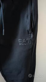 Pantalone tuta da uomo Emporio Armani linea EA7, taglia S colore nero con bande color grigio e giallo sulle gambe e logo EA7 su coscia sinistra.