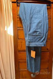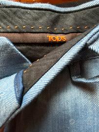 Pantalone marca Tod's, tessuto in twill blu carta da zucchero. Mai utilizzati, con cartellino. Taglia M, chiusura classica con patta e cuciture precise, orlo da rifinire in base alle esigenze.