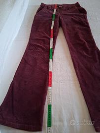Comodo e morbido pantalone in velluto a coste larghe, color vinaccia. Gamba leggermente a zampa. Chiusura anteriore molto spiritosa. Vita medio-bassa. Si abbina con la sua giacchina quadrettata, corta, avvitata. Completino molto luminoso tutto Max & Co, in ottimo stato, nessun segno del tempo.