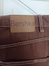 pantaloni palazzo,vita alta,cotone pesante,colore marrone castagna,con tasche anteriori e posteriori,impunture chiare alle cuciture.