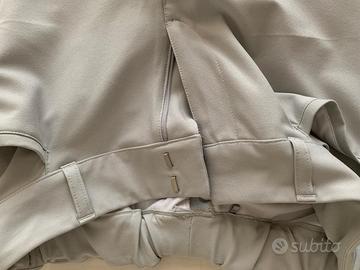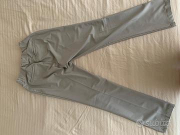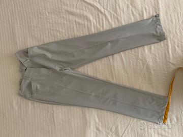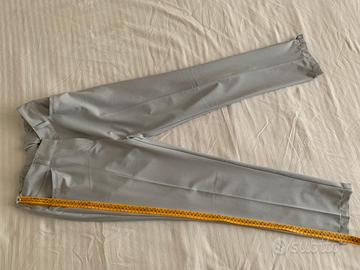 Pantaloni Adidas grigi, taglia 38 (vita circa 35 cm, lunghezza gamba circa 99 cm). Modello con tasche posteriori e passanti per cintura, chiusura con zip e gancio. Tessuto tecnico leggero, ideale per uso sportivo o casual. Solo spedizione, no consegna a mano.