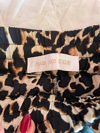 Favolosi pantaloni animalier con elastico in vita dotato di laccetto in ecopelle nero, tasche laterali e polsini alle caviglie con bottoncini sempre in ecopelle nera.