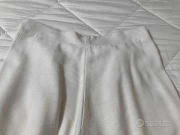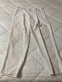 Pantaloni bianchi, zampa di elefante con cinturino in vita, cerniera a lampo e bottone, senza tasche dietro solo con tasche laterali a taglio