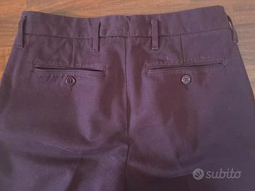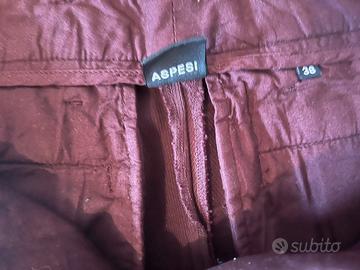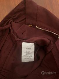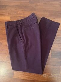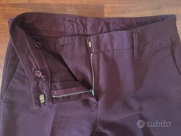 Pantaloni Aspesi, taglio classico, taglia IT 38, 100 % cotone pesante, lavorato spigato, chiusura con cerniera, gancio e bottone, tasche davanti a filetto, tasche posteriori chiuse con bottone, colore bordeaux, misure vita 36 cm, lunghezza 94 cm, caviglia 16 cm. Made in Italy. Condizioni perfette.