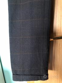 Pantaloni ragazzino fantasia a quadri, vita con passanti e chiusura zip con bottone. Modello elegante con risvolto. Tessuto in cotone pesante
